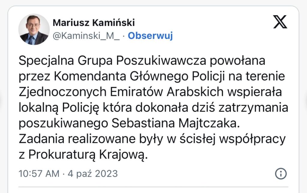 "Specjalna Grupa Poszukiwawcza powołana przez Komendanta Głównego Policji na terenie Zjednoczonych Emiratów Arabskich wspierała lokalną Policję która dokonała dziś zatrzymania poszukiwanego Sebastiana Majtczaka. Zadania realizowane były w ścisłej współpracy z Prokuraturą Krajową" - napisał Mariusz Kamiński.