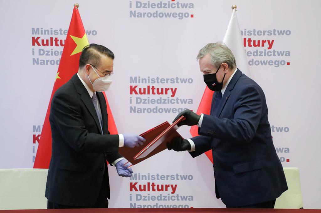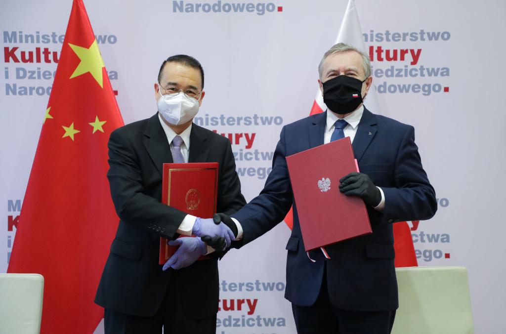 Wicepremier, minister kultury, dziedzictwa narodowego i sportu prof. Piotr Gliński wraz z ambasadorem Chińskiej Republiki Ludowej Liu Guangyuan podpisał dziś Protokół o współpracy kulturalnej między Ministrem Kultury, Dziedzictwa Narodowego i Sportu Rzeczypospolitej Polskiej a Ministerstwem Kultury i Turystyki Chińskiej Republiki Ludowej - dokument dotyczący współpracy kulturalnej.