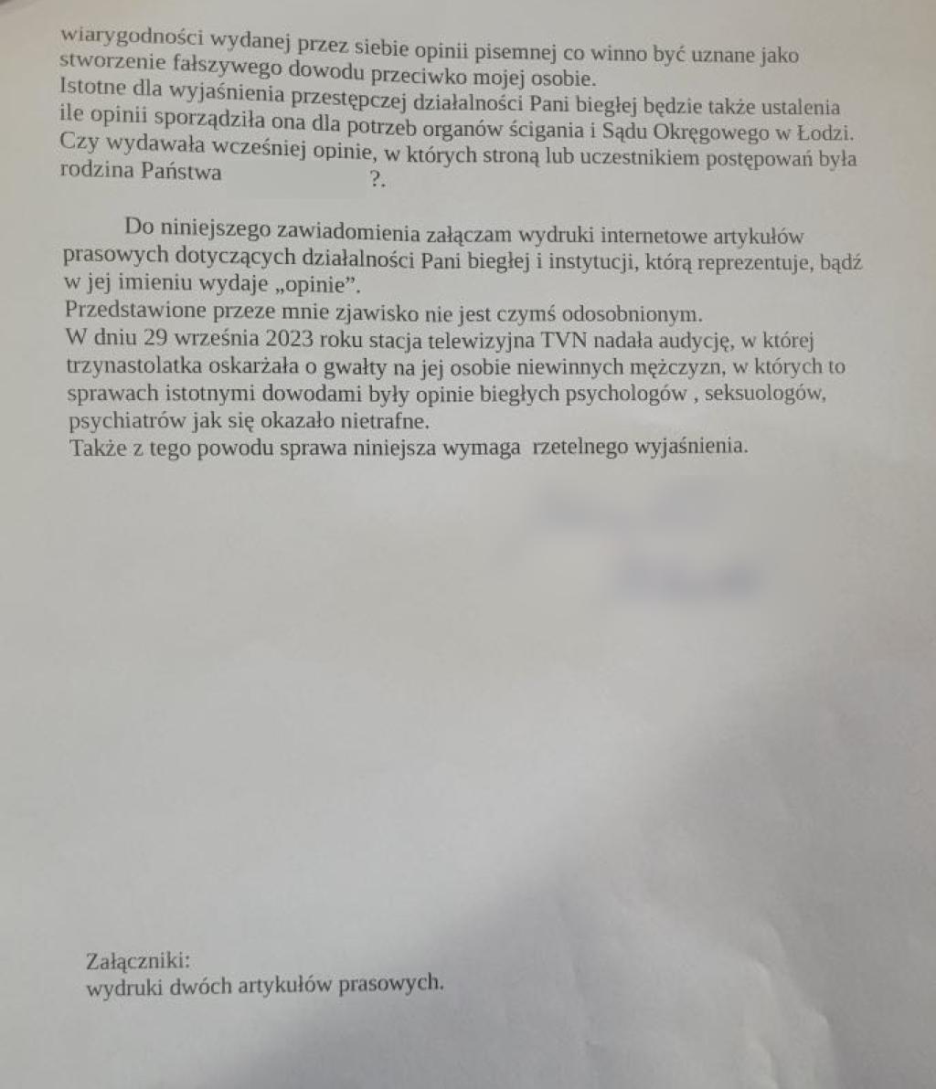 Tymczasem dzień później, 4 października 2023, do naszej redakcji zgłosił się inny mieszkaniec okręgu łódzkiego. Okazuje się, że również 3 października 2023 on też zgłosił do Prokuratury Rejonowej Łódź Śródmieście zawiadomienie o możliwości popełnienia przestępstwa przez tę samą fałszywą biegłą sądową Agnieszkę Juszczyk Mirek!