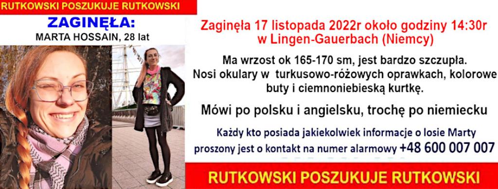 Każdy kto posiada jakiekolwiek informacje o losie Marty, proszony jest o kontakt na numer alarmowy BIURA RUTKOWSKI +48 600 007 007.