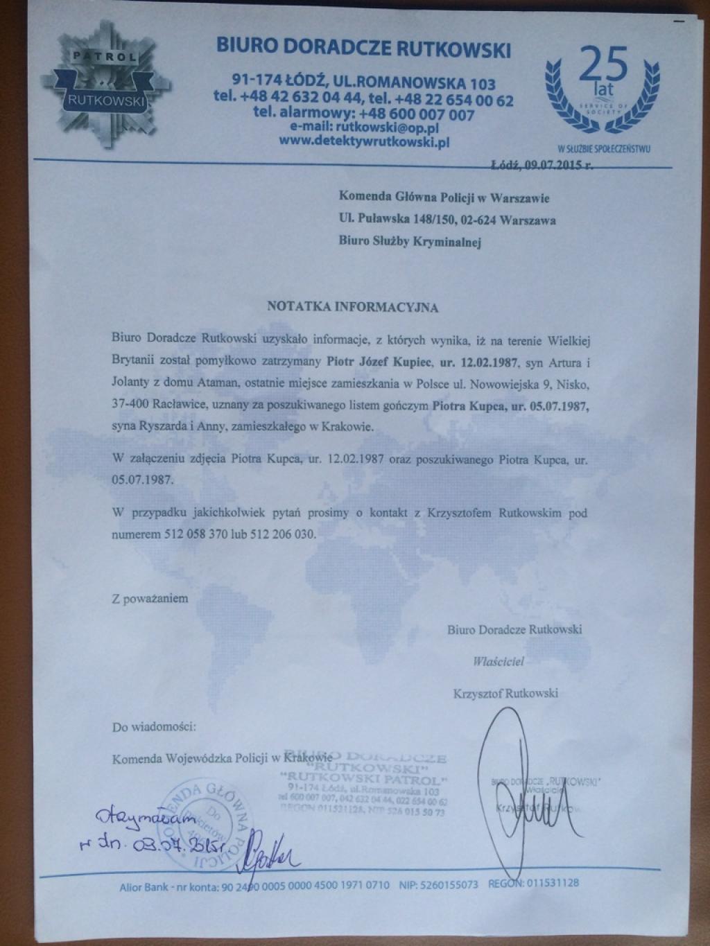 W dniu dzisiejszym Biuro Doradcze Rutkowski przekazało notatkę informacyjną wraz ze zdjęciami do Biura Służby Kryminalnej Komendy Głównej Policji w Warszawie oraz do Komendy Wojewódzkiej Policji w Krakowie i Londynie.