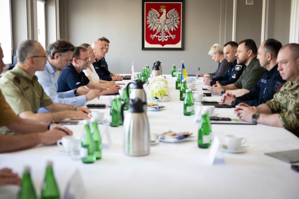 26 czerwca br., w Rzeszowie odbyło się spotkanie ministrów Mariusza Kamińskiego oraz Ihora Klymenki. Szefowie resortów spraw wewnętrznych Polski i Ukrainy rozmawiali m.in. o wsparciu sprzętowym dla ukraińskich służb mundurowych. W spotkaniu wzięli także udział wiceminister Bartosz Grodecki oraz komendanci Policji, Straży Granicznej oraz Państwowej Straży Pożarnej.