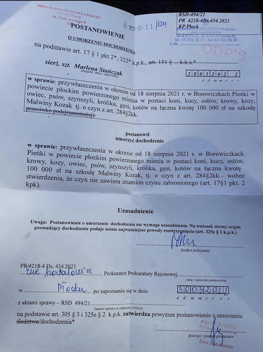 Zwróciła się więc po pomoc do policji zawiadamiając o przestępstwie przywłaszczenia. Ale postępowanie w tej sprawie policja umorzyła. Zwierzęta po raz ostatni widziane były we wsi Borowiczki Pieńki, w gminie Słupno, w powiecie Płock, w województwie mazowieckim.