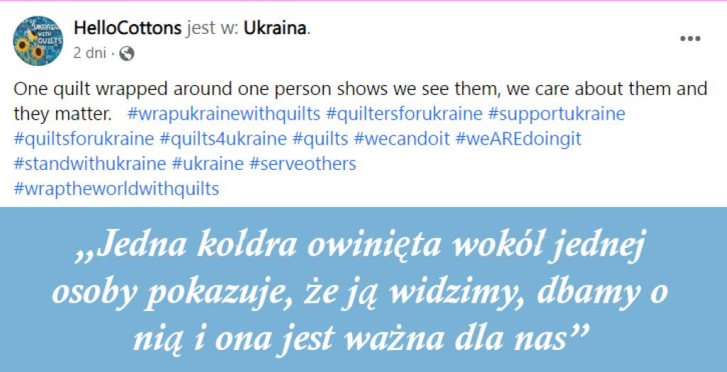 Największa zbiórka przytulnych kolorowych koców, kołdr, narzut zrobionych przez mieszkańców Stanów Zjednoczonych trafiła do Polski i na Ukrainę. Po 24 lutym, kiedy wybuchła wojna na Ukrainie, zaczęto zbierać kołdry i koce dla ukraińskich uchodźców #wrapukrainewithquilts. Ta fantastyczna inicjatywa zgromadziła już ponad 12000 kołder.