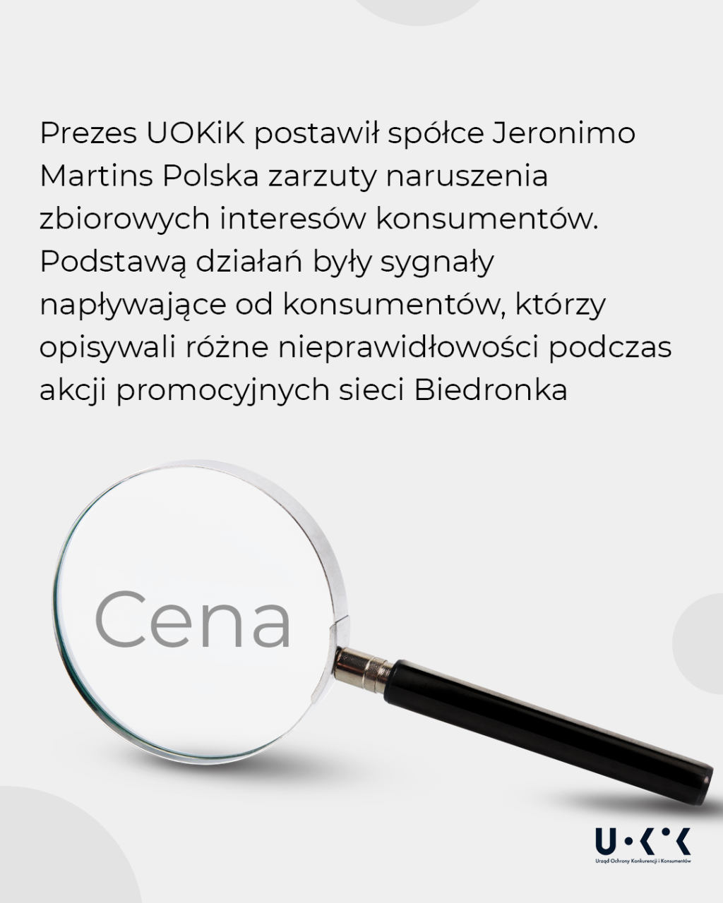 - Podczas zakupów cena jest kluczowym czynnikiem dla konsumentów – część z nich wybiera najtańsze produkty, inni analizują relację ceny do jakości. W obu przypadkach, do podjęcia świadomej i racjonalnej decyzji, konsumentom niezbędna jest jasna informacja o ostatecznej cenie produktu. Natomiast na etykietach cenowych w sklepach Biedronka znajdowały się informacje wprowadzające konsumentów w błąd lub nieczytelne, stąd postawione spółce Jeronimo Martins Polska i jej trzem menedżerom zarzuty łamania podstawowych praw konsumentów dotyczących informowania o cenie. Jest to jasny sygnał również dla innych uczestników rynku, by nie tworzyć niejednoznacznych i skomplikowanych, a tym samym wprowadzających w błąd, obniżek cenowych – wyjaśnia Prezes UOKiK Tomasz Chróstny.