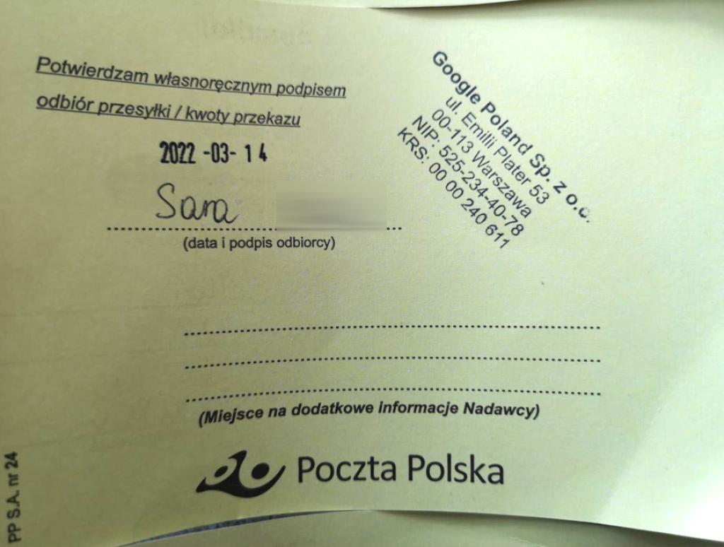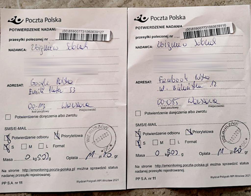 Zbigniew Sobczak napisał więc listy polecone i wysłał je za potwierdzeniem odbioru do obu polskich biur Facebooka i Google’a w Warszawie. Wysłał je 11 marca 2022 a potwierdzenia odbioru wskazują, iż oba koncerny odebrały te listy 14 marca (dowody nadania i odbioru dołączamy do niniejszego tekstu).