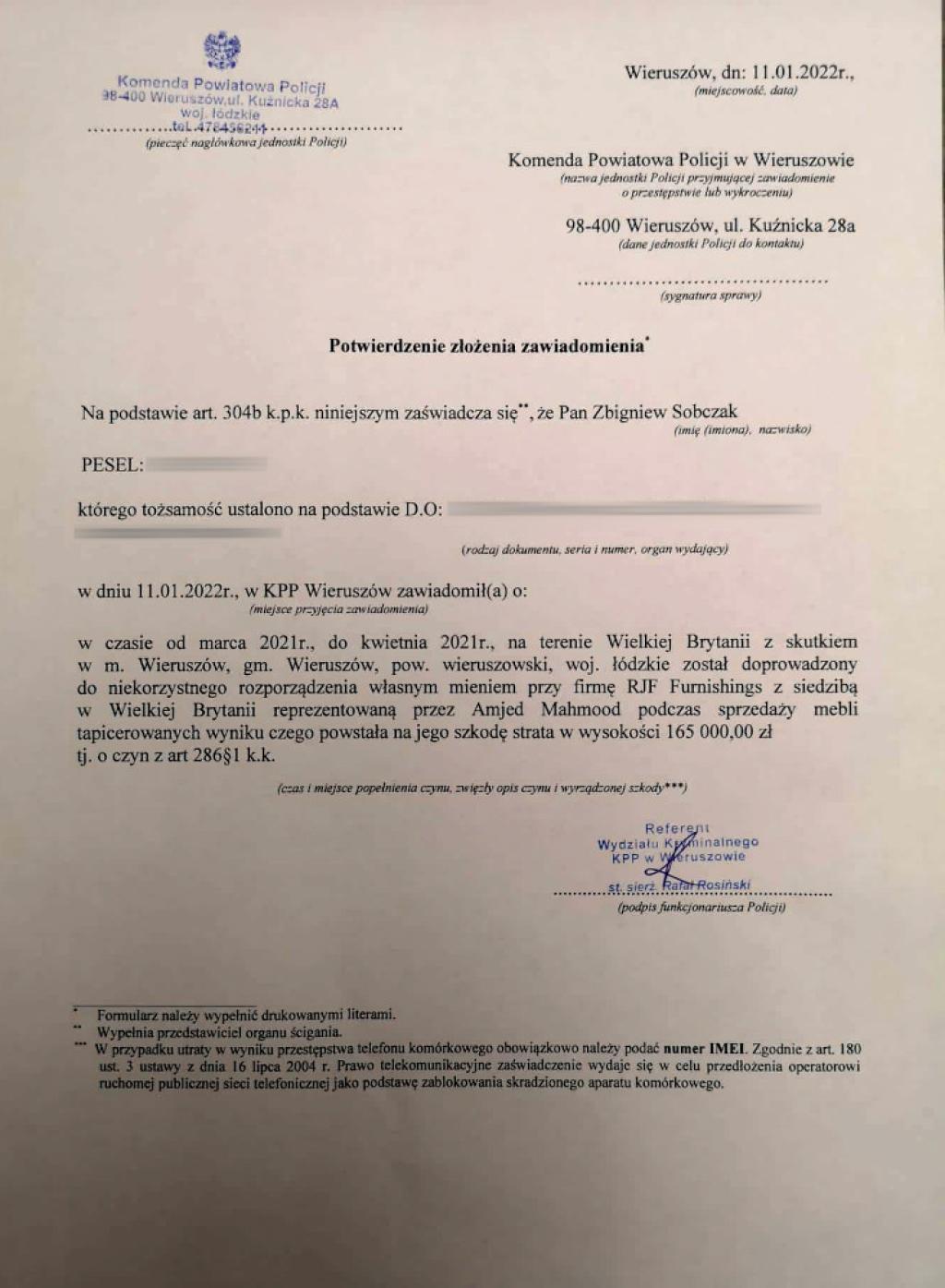 O przestępstwie na szkodę Zbigniewa Sobczaka ze strony firmy RJF FURNISHINGS piszemy od wielu miesięcy. Wszystkie artykuły znajdziesz pod linkiem: