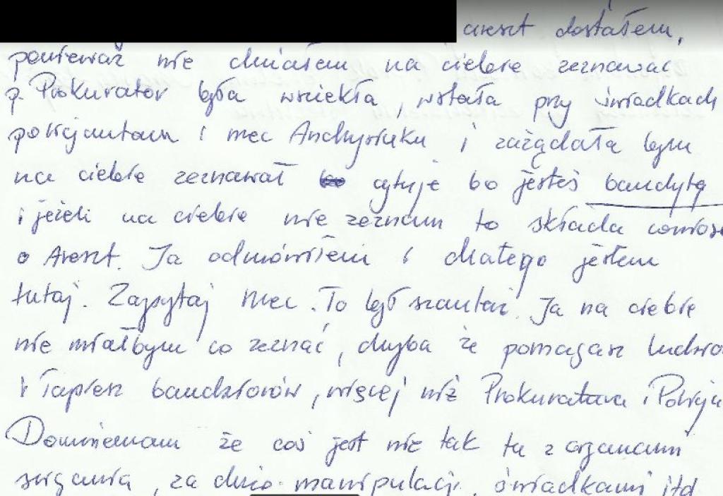 - Ja na ciebie nie miałbym co zeznać, chyba, że pomagasz ludziom i łapiesz bandziorów więcej niż Prokuratura i Policja. Domniemam, że coś jest nie tak tu z organami ścigania za dużo manipulacji, świadkami itd. - dodaje w swoim liście Dawid K.