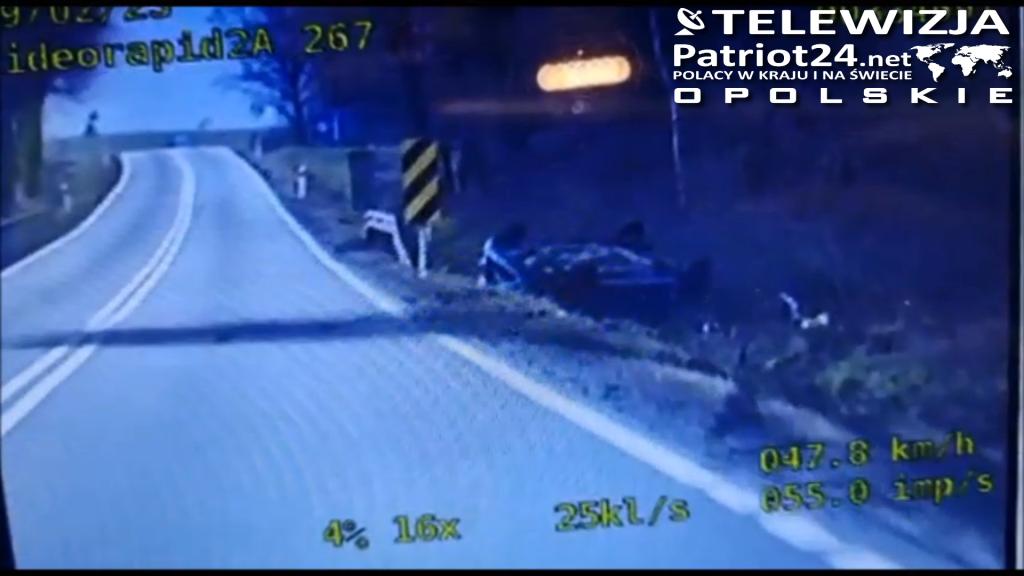 Kamera radiowozu z Komendy Powiatowej Policji w Strzelcach Opolskich nagrała moment, w którym kierująca hyundaiem straciła panowanie nad pojazdem i, dachując, wpadła do przydrożnego rowu. Na szczęście 40-latce i dwójce jej dzieci nic poważnego się nie stało - skończyło się na siniakach i stratach materialnych.