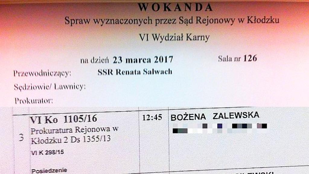 Zrobiła to kiedy jej wniosek o ukaranie prokurator Sałackiej został przez tutejszą prokuraturę umorzony. Bożena Zalewska zaskarżyła tę decyzję i teraz będzie tę skargę rozpatrywał sąd w... Kłodzku!