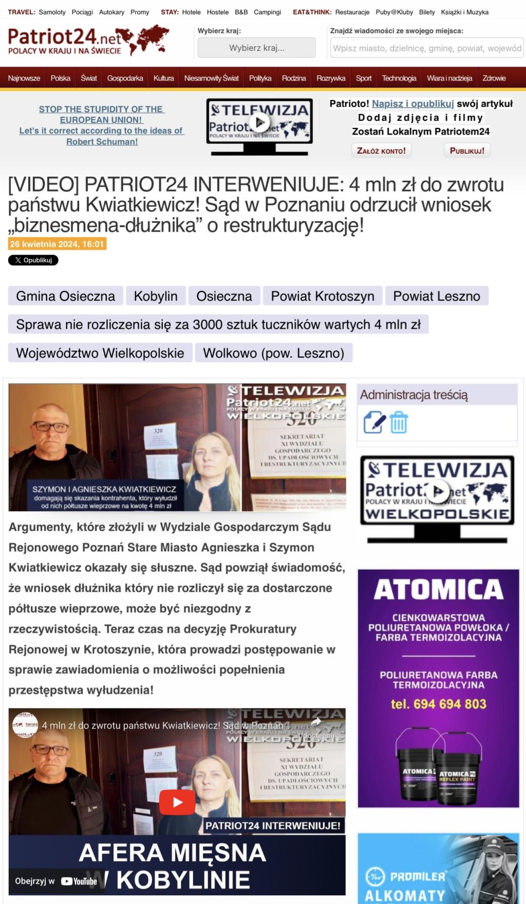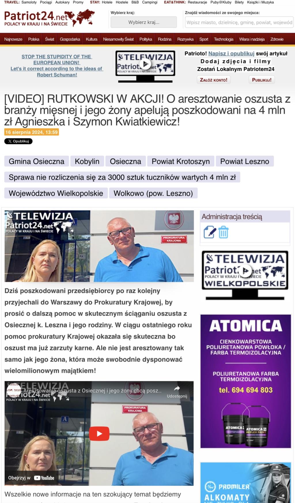 Przedwczoraj tj. w środę 18 września 2024 Prokuratura Rejonowa w Krotoszynie postawiła oszustowi z branży mięsnej spod Leszna osiem kolejnych zarzutów karnych, zwiększając ich liczbę łącznie do dziewięciu. Dlatego teraz państwo Kwiatkiewicz będą domagać się kary więzienia dla żony tego oszusta, która świadomie przejęła jego majątek, krzywdząc ich jako wierzycieli!