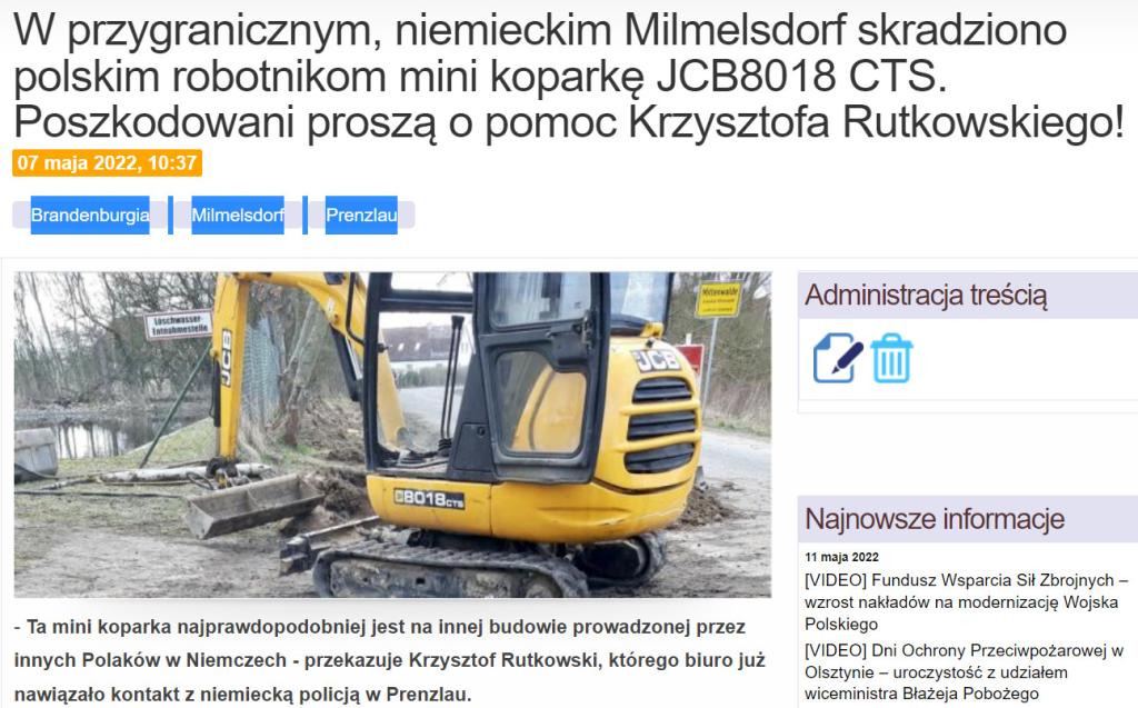 Kiedy nasza telewizja chciał zrealizować reportaż na temat tego skandalu nagle pojawił się oficer kryminalny który oświadczył że w poniedziałek pod Berlinem zabezpieczono dwie skradzione przez niemieckiego złodzieja koparki.
