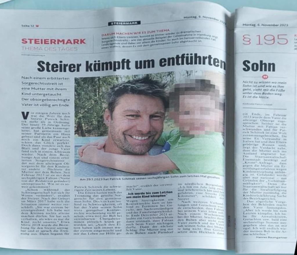 Po weekendzie spędzonym z matką, nie oddała ona chłopca ojcu, a ojciec nie widział syna przez trzy miesiące. Sąd położył kres tym przepychankom. W lutym 2023 r. ojcu przyznano wyłączną opiekę nad dzieckiem. Od tego czasu matka zniknęła wraz z Fabianem, a świat Patricka Schittka zawalił się. Ponieważ jego była ma krewnych we Włoszech, a jej rodzice pochodzą z Rosji, podejrzewa się, że matka uciekła za granicę. Prokuratura w Eisenstadt, na zapytanie "Krone" potwierdziła, że przeciwko matce toczy się dochodzenie w sprawie uprowadzenia dziecka. Dochodzenie jest jednak prowadzone tylko na szczeblu krajowym - ze względu na "proporcjonalność". Wynika to z faktu, że prokuratura jest odpowiedzialna tylko za ściganie matki, a sąd rejonowy jest odpowiedzialny za zwrot dziecka.