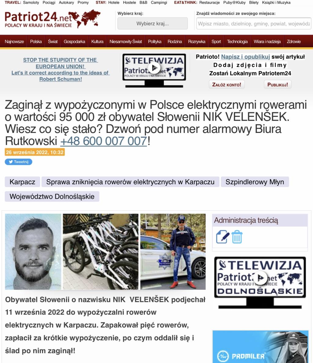 ![[VIDEO] PATRIOT24 RUTKOWSKI W AKCJI: Gdzie jest 5 rowerów elektrycznych o wartości 95 000 zł wywiezionych z Karpacza? Są zapisy z monitoringu ja wywozi jak obywatel Słowenii NIK VELENŠEK](/cache/298/1664269952_c81e728d9d4c2f636f067f89cc14862c.jpg)