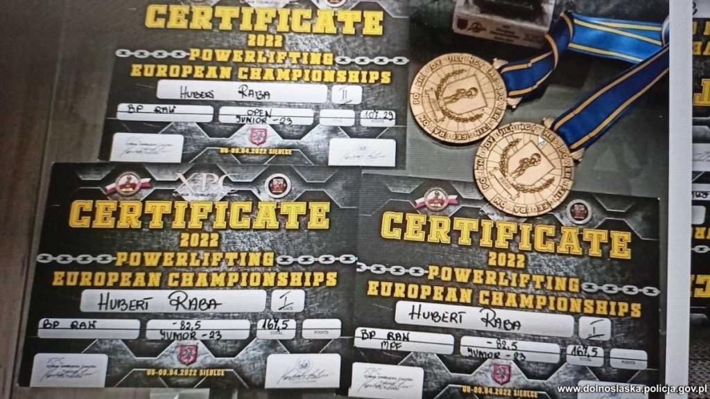 Nasz reprezentant, pomimo intensywnego i wyczerpującego sezonu, nie poddał się i w dniach od 6 do 9 kwietnia wziął udział w zawodach European Championship 2022 zorganizowanych po raz kolejny w Siedlcach. W trakcie zawodów w konkurencji wyciskanie leżąc typu PB RAW (bez sprzętu) policjant strzelińskiej jednostki w kategorii wagowej 82, 5 kg zajął 1 miejsce w klasyfikacji służb mundurowych, 1 miejsce w klasyfikacji Junior oraz 2 miejsce w klasyfikacji Open. Warto wspomnieć, że podczas zawodów nasz reprezentant ustanowił rekord życiowy w wyciskaniu leżąc uzyskując wynik 167, 5 kg. Zostało to uwiecznione w materiale wideo.