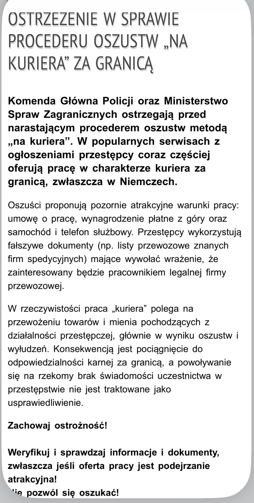 Komenda Główna Policji oraz Ministerstwo Spraw Zagranicznych ostrzegają przed narastającym procederem oszustw metodą „na kuriera”. W popularnych serwisach z ogłoszeniami przestępcy coraz częściej oferują pracę w charakterze kuriera za granicą, zwłaszcza w Niemczech.