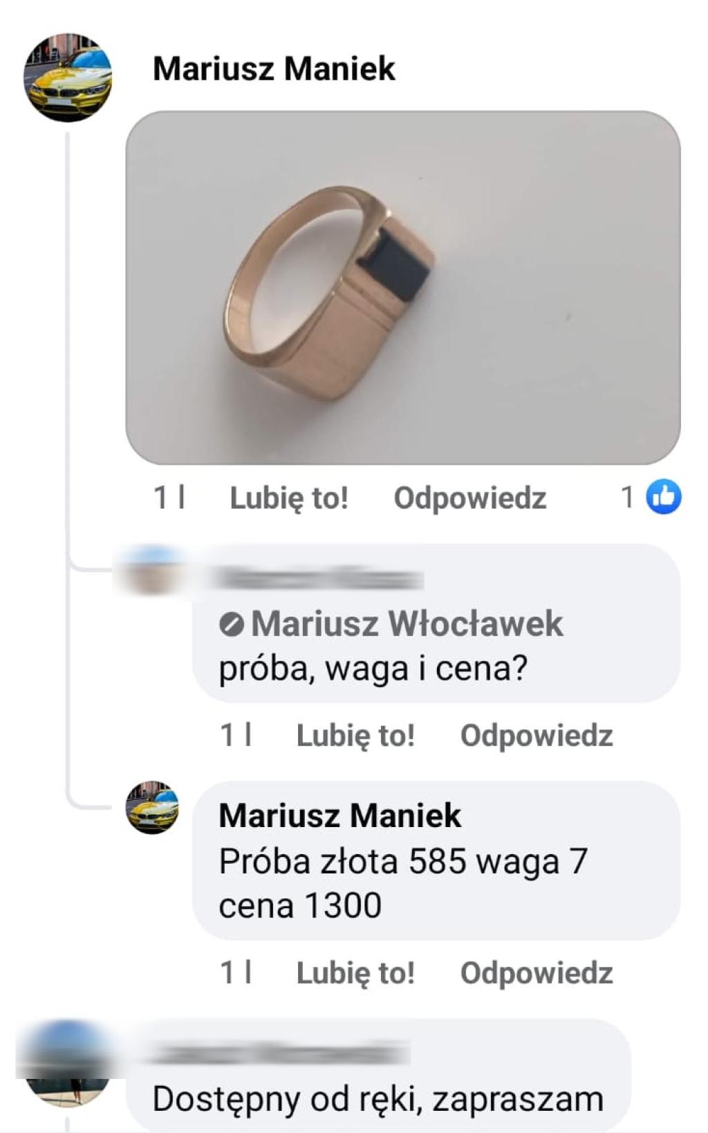 Były policjant sprzedawał przywłaszczoną biżuterię, korzystając z fałszywych kont na Facebooku. Pierwsze z nich funkcjonowało pod nazwą „Mariusz Włocławek”, a kolejne – „Mariusz Maniek”. W ten sposób udało mu się oszukać wiele osób, które nabyły złote precjoza nieświadome ich pochodzenia. Żadna złotówka z tej działalności nie trafiła do rąk poszkodowanego, a były funkcjonariusz przywłaszczył sobie wszystkie pieniądze.