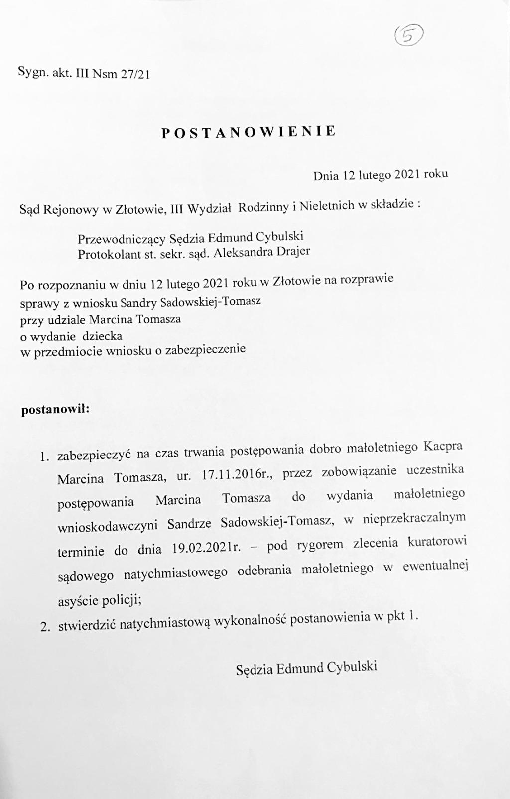 A ten, bez przebadania nagrań, bez przesłuchania matki i jej konkubenta na okoliczność zagrożenia zdrowia i życia dziecka, nakazał Marcinowi Tomaszowi natychmiastowy zwrot 4-latka matce! Z użyciem kuratora i policji!
