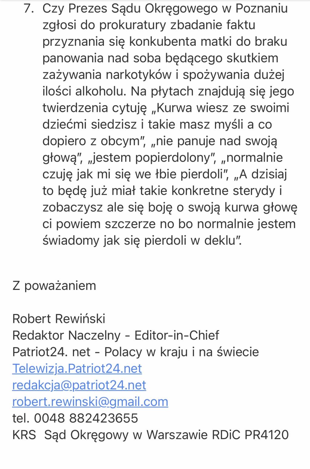 Pytania dotyczące tego wstrząsającego narażenia na utratę zdrowia i życia 4-latka przez przyzwolenie na tę realną zbrodnię zarówno ze strony Sądu Rejonowego w Złotowie jak i Delegatury Sądu Okręgowego w Pile, przesłaliśmy prezesowi Krzysztofowi Lewandowskiemu w środę. Do tej pory odpowiedzi nie otrzymaliśmy.