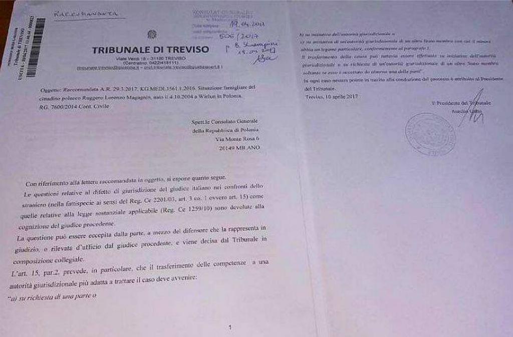 - IL Consolato di Milano ha ricevuto dal Presidente del tribunale di Treviso Aurelio Gatto una lettera che la sua corteha subordinato eil giudice è pronto a passare la causa del mio bambino al tribunale di Sieradz - trasmete oggi all portale Patriot24.net contenta Wioleta Wrzosek.