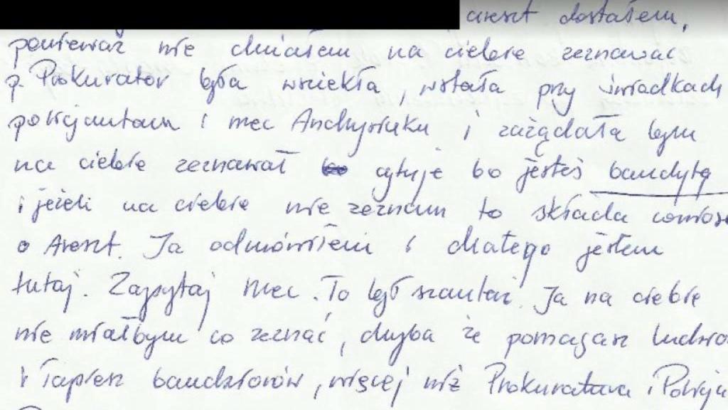 - "...Ja na ciebie nie miałbym co zeznać, chyba, że pomagasz ludziom i łapiesz bandziorów więcej niż Prokuratura i Policja. Domniemam, że coś jest nie tak tu z organami ścigania za dużo manipulacji, świadkami itd...." - dodaje w liście wysłanym z koszalińskiego aresztu.