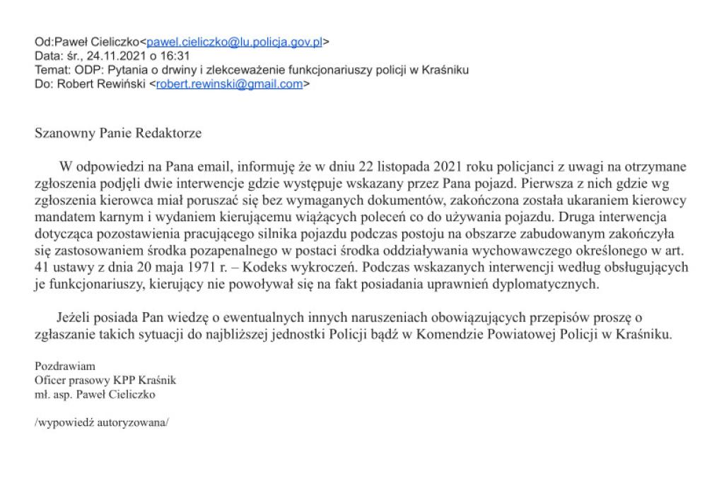 Czy oszust-cudzoziemiec, który rezyduje w Kraśniku, jest ponad prawem? Kto mu pozwala, by jeździł samochodem na rzekomych numerach dyplomatycznych a bez ubezpieczenia i przeglądu technicznego?