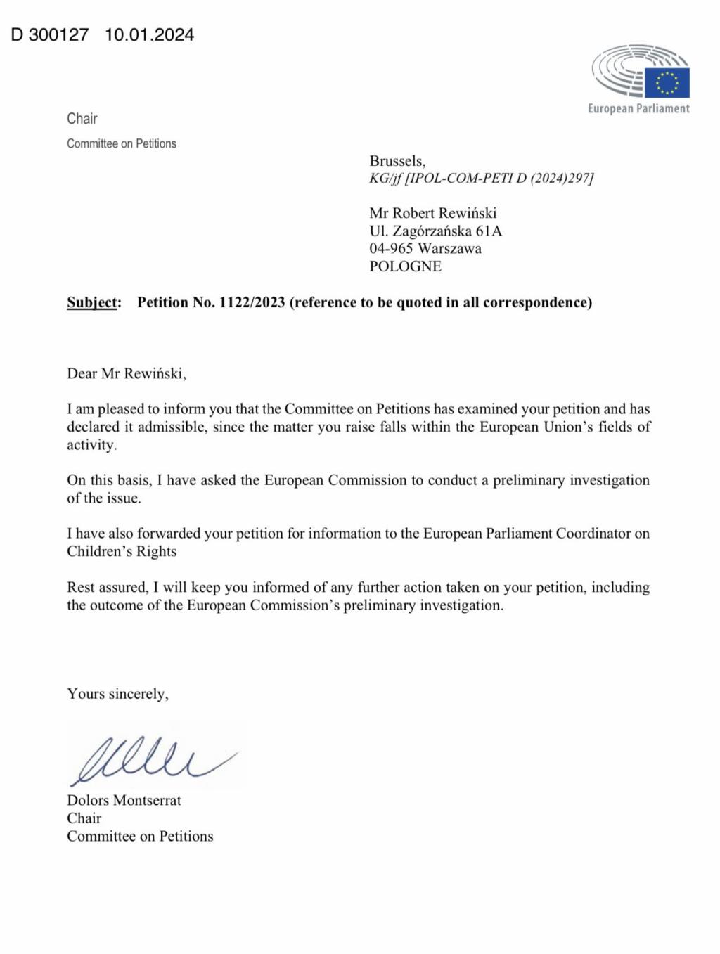 Przesłałam również Panstwa petycję w celu uzyskania informacji do Koordynatora Parlamentu Europejskiego ds. praw dziecka.