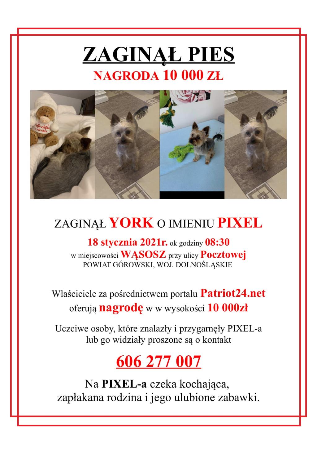 Zrozpaczeni właściciele za pośrednictwem portalu Patriot24.net oferują nagrodę w w wysokości 10 000zł. Uczciwe osoby, które znalazły i przygarnęły PIXEL-a lub go widziały proszone są o kontakt pod numerem telefonu 606 277 007.